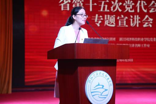 为全面学习贯彻浙江省第十五次党代会精神,6月28日下午,省直机关工委机关青年巡回宣讲团和学校党委宣传部联合主办、“钱江潮”理论宣讲工作室承办的省第十五次党代会精神专题宣讲活动在我校水韵剧场举行。省直机关工委宣教部部长周招满、省水利厅直属机关党委副书记王新辉、机关青年巡回宣讲团成员、学校领导班子成员、副处级及以上干部、青年教职工代表及学生代表参加活动。