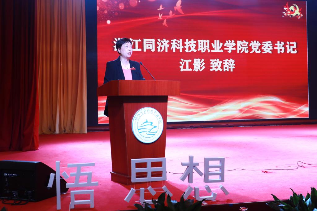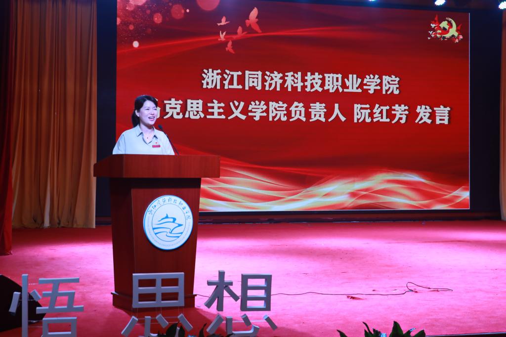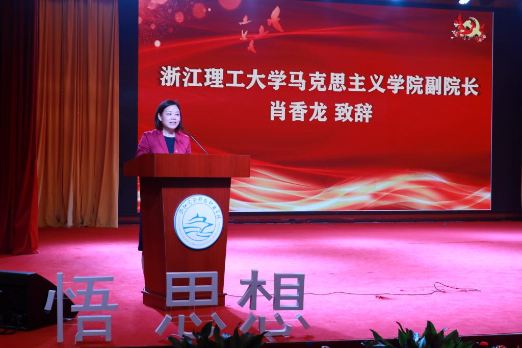 校党委书记江影致辞,她向参加活动的领导专家表示欢迎,向与学校共建马克思主义学院的浙江师范大学、浙江理工大学以及各兄弟高职院校的专家同仁表示衷心感谢。江影指出此次成立马克思主义学院,是学校认真学习贯彻中央决策部署以及习近平总书记系列重要讲话精神,为适应高校思想政治教育发展和马克思主义理论研究的新形势,进一步提升思想政治工作水平,推进马克思主义理论学科建设的重要举措。江影对马克思主义学院的发展提出三点要求:一是坚持政治立院,强化理论武装,高标准建设马克思主义研究阵地。要充分发挥思政课在课程体系中的政治引领和价值引领作用,坚持用马克思主义观察时代、解读时代、引领时代,做好党的传声筒、扬声器,努力推出高水平理论成果。二是坚持改革兴院,提升育人质量,高水平构筑马克思主义宣传阵地。要积极打造思政“金课”,提升学科建设质量,推进思想政治理论课与各类课堂教学同向同行,提高育人水平,在培养社会主义事业可靠建设者和接班人上求实效。三是坚持人才强院,聚焦学科建设,高质量打造马克思主义教学阵地。要加快实施“名师工程”“共建规划”和“高端人才引进计划”,形成自己的人才高地,增强学院实力、提振学院影响力。