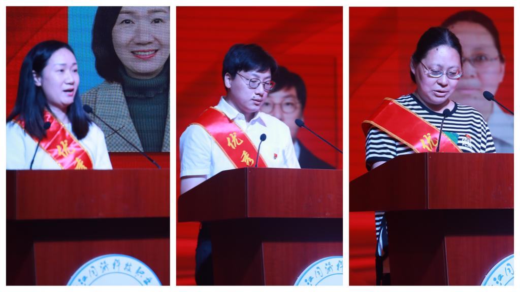 党委委员、副校长沈自力宣读学校2021年度“两优一先”名单和党建工作成果。校领导分别为获得“两优一先”的个人和组织颁发荣誉证书,并合影留念,希望获得表彰的个人和集体在工作中继续发挥先锋模范作用。优秀共产党员代表吴闽黎、肖德彬和邱榕先后作先进事迹汇报,他们朴实的话语、平凡又感人的事迹、真挚的情感深深地打动了在场的党员同志。