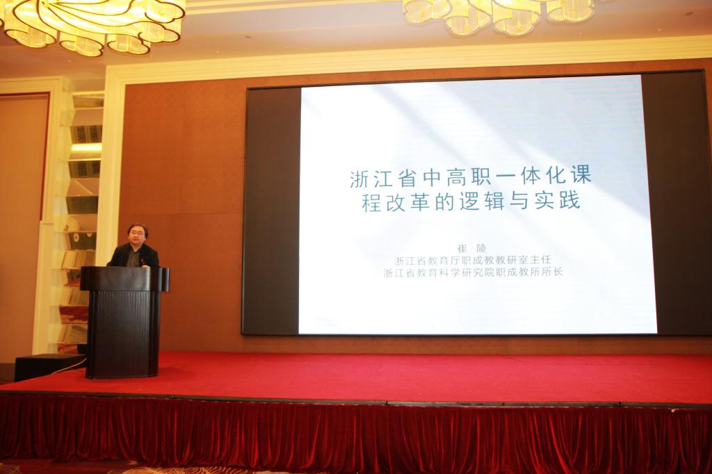 浙江省教育科学研究院职业与成人教育研究所所长崔陵在会上作了题为《浙江省中高职一体化课程改革的逻辑与实践》的主旨报告。崔陵全面分析了“十四五”期间浙江省职业教育发展面临的新形势,从职业教育是一种类型教育、构建现代化职教体系、职业教育有高水平发展的内在需求、深化产教融合推进职教高质量发展四个方面深刻阐释了浙江省中高职一体化课程改革的内在逻辑,并对浙江省中高职一体化改革指导思想、改革方案、技术路线、改革思路做了详细介绍。