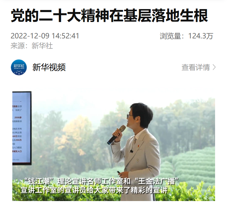 2022年12月9日,新华社新华视频栏目以《党的二十大精神在基层落地生根》为题,详细报道各地党的二十大精神宣讲队伍开展多主体、多层次、广覆盖的“立体化”学习宣讲活动,以实际行动把党的二十大精神送到基层一线。在报道浙江基层学习贯彻党的二十大盛况时,特别呈现了“钱江潮”理论宣讲名师工作室赴湖州开展学习宣讲活动,这也是新华社的镜头首次聚焦报道我校工作。