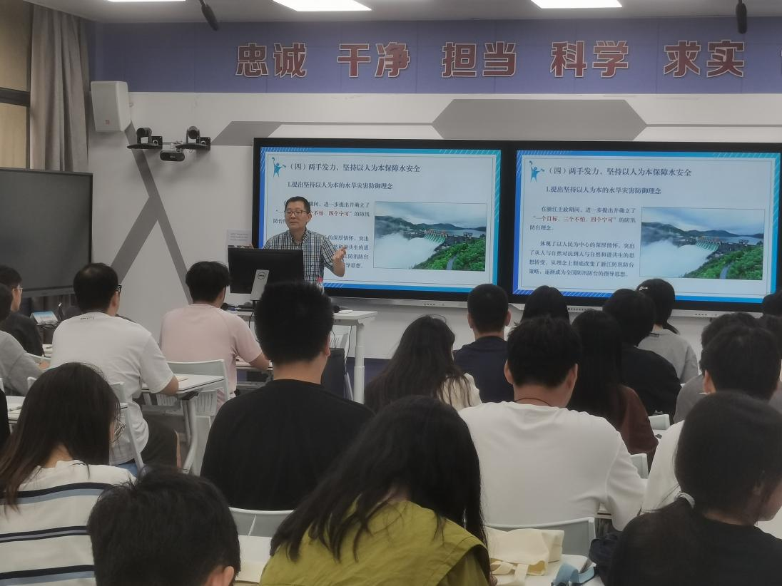 吴宏平副书记围绕“新时代治水思路”“新时代水利精神”“新时代水利事业成效”“新时代水利人的新要求”四个方面,结合自身经历,带领同学们回顾学习了“忠诚、干净、担当,科学、求实、创新”的新时代水利精神内涵,用一个个感人的故事阐述了一代代水利人的初心、使命和担当。吴宏平副书记对学员提出三点要求,一要坚定理想信念永远跟党走,要时刻以党员的标准要求自己,锤炼水利人忠于党、忠于国家、忠于人民、忠于水利事业的优秀政治品格;二要弘扬和传承老一辈水利人的治水精神,保持求真务实的作风,真抓实干,开拓进取,扛起水利人的责任和担当;三要扎实学好专业知识,努力练就过硬本领。