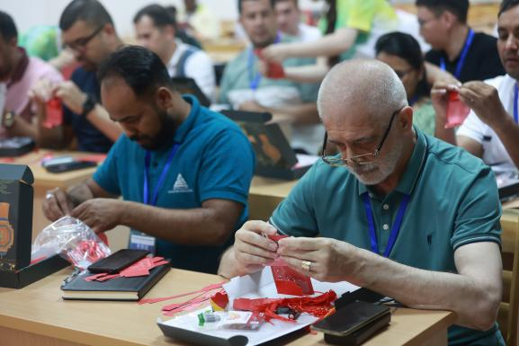 本次活动参与人员为我校今年承接的首个线下国际研修班学员,来自苏里南、蒙古、尼日利亚、塔吉克斯坦、秘鲁、约旦、北马其顿、巴拿马、尼泊尔和委内瑞拉等共计17个国家的30余名学员现场参加此次实践活动。国家级非遗项目仙居花灯在本次活动中以其东方神灯的神奇魅力,学员们赞叹不已。在志愿者的讲解和教学下,大家亲手体验了针刺无骨花灯的制作过程,感受了花灯的魅力和动手的乐趣,领略了非遗文化的独特风采。