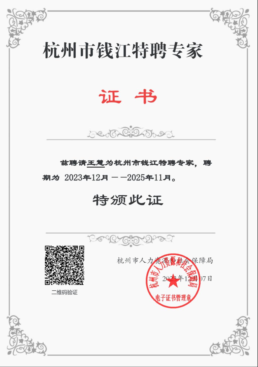我校王慧老师荣获“杭州市钱江特聘专家”称号
