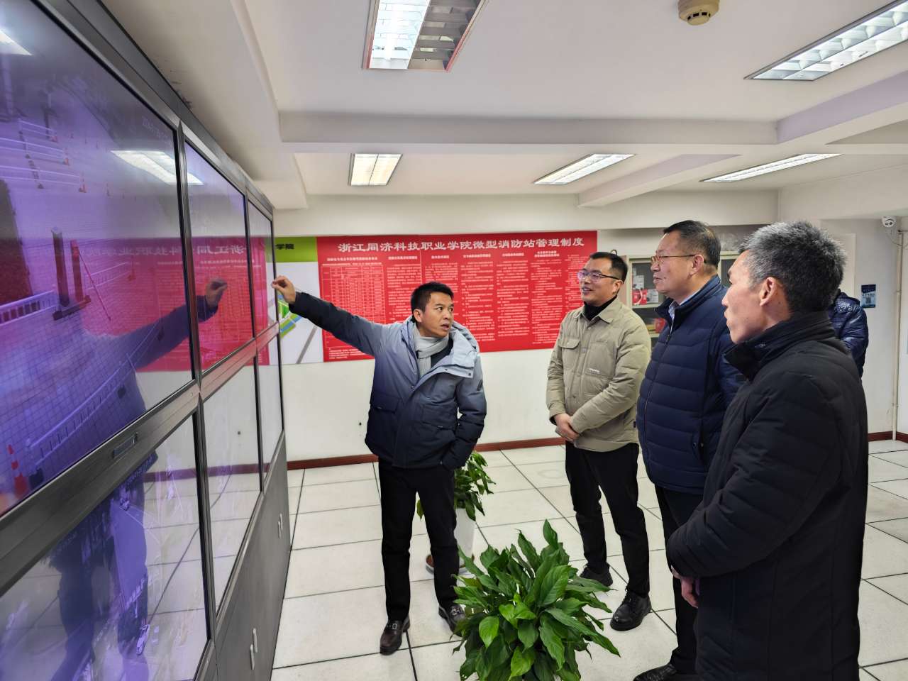 1月29日下午,学校领导张勇、王卫标、姜伟、吴敏启带队,后勤处、保卫处等相关部门负责人及工作人员组成安全检查组,开展春节前校园安全大检查,并深入一线慰问坚守工作岗位的安保及后勤保障人员。