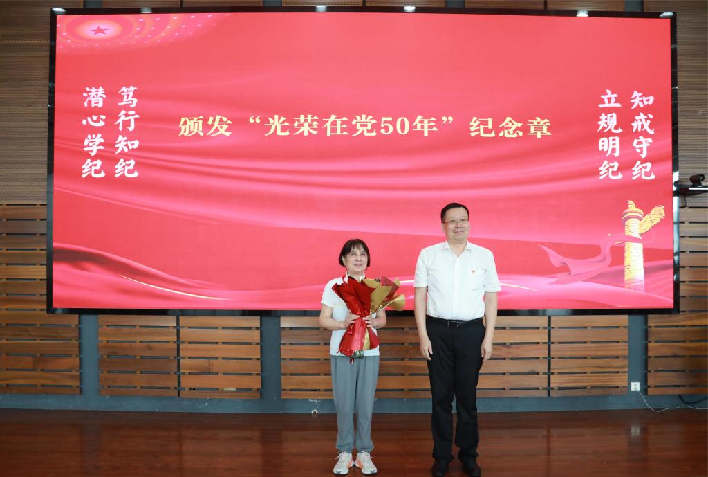 张勇书记代表学校党委向“光荣在党50年”的老党员致以崇高敬意,向受到表彰的优秀个人和先进集体表示祝贺,向学校广大党员师生致以节日的问候。他指出,七一主题党日活动是学校一年一度的党建标志性活动,通过重温誓词、表彰先进、宣讲理论,以庄重而又朴实的方式庆祝中国共产党成立103周年。他结合正在开展的党纪学习教育,强调全体党员要把好思想信念“总开关”、系好遵规守纪“安全带”、坚持干事创业“风向标”,以先进典型为标杆,以勤廉并重为追求,将榜样力量转化为攻坚克难、砥砺奋进的强大动力,把对党忠诚的铮铮誓言贯穿到党的教育事业中去,开拓进取,锐意改革,在强化党建引领、深化产教融合、拓展科技服务、提升育人实效中牢记初心使命,为学校事业内涵式高质量发展积极贡献自己的力量。