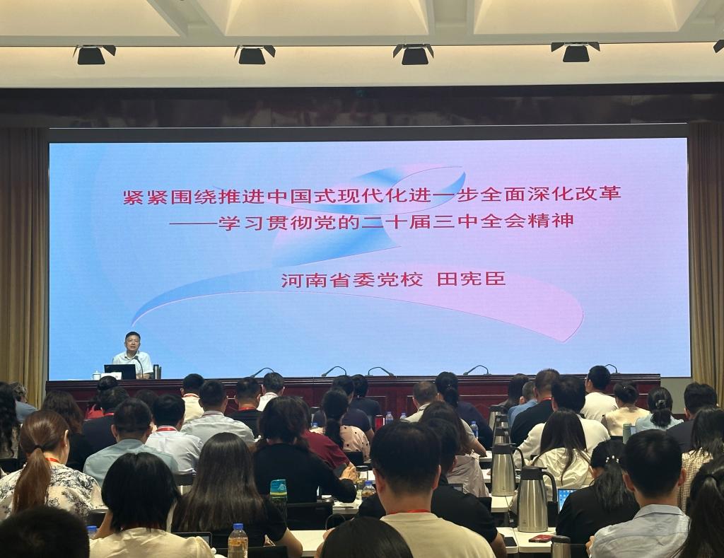 本次培训邀请了河南省委党校哲学教研部主任、博士、二级教授田宪臣,科学社会主义教研部讲师董学宾等2位专家分别作专题讲座。田教授以《紧紧围绕推进中国式现代化进一步全面深化改革,深入学习党的二十届三中全会精神》为题,从全会的重大时代意义、基本框架和特点、主要内容等方面对全会精神进行了深入阐释和解读。董老师以《学习贯彻党的二十届三中全会》为题,围绕全面深化改革,从推进中国式现代化的重要性、重大部署和注入新动能、抓好改革落实等方面对全会精神进行系统讲解。两场专题讲座主题鲜明、条理清晰,既严谨深刻,又系统全面,对帮助干部深刻领会党的二十届三中全会精神具有很强的理论价值和现实指导作用。
