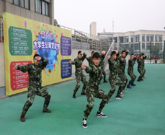 首先,学工部副部长、团委副书记叶乐介绍第六届公寓文化节系列活动,其次学生会毛润泽发言,他代表学生会将努力让文明之花盛开在公寓的每一个角落里,接着30名退伍军人组成的国旗班为同学们表演了擒敌拳和叠军被示范。