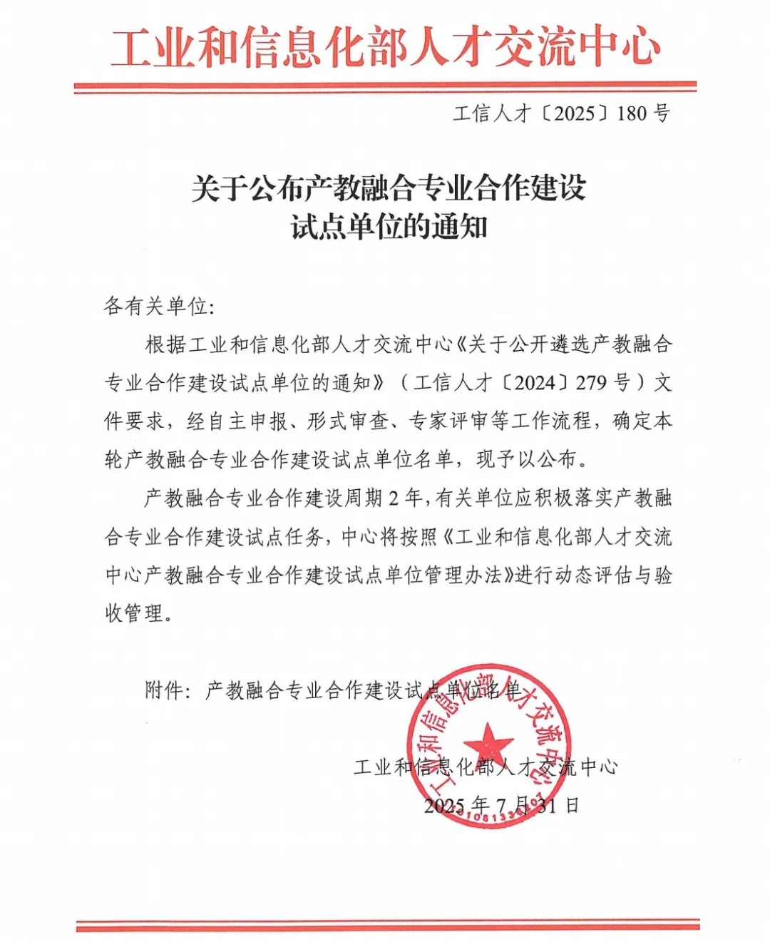 近日,工业和信息化部人才交流中心正式公布产教融合专业合作建设试点单位名单。我校数控技术专业凭借突出的产教融合实践基础和显著的建设成效成功入选,成为全国144所获批高职院校之一。此次入选,是对我校数控技术专业人才培养模式创新和校企协同育人成果的认可,标志着专业建设迈入服务国家战略需求、对接产业升级发展的新阶段。