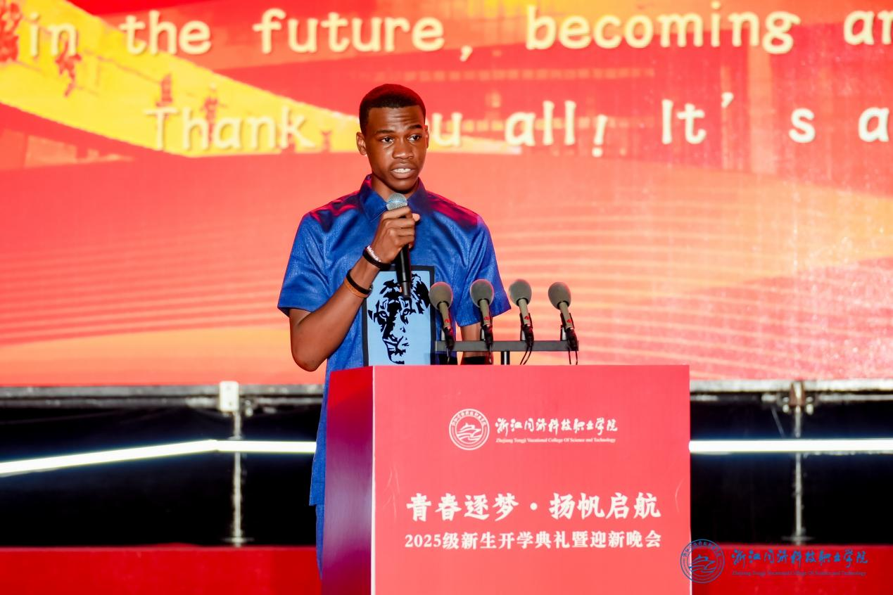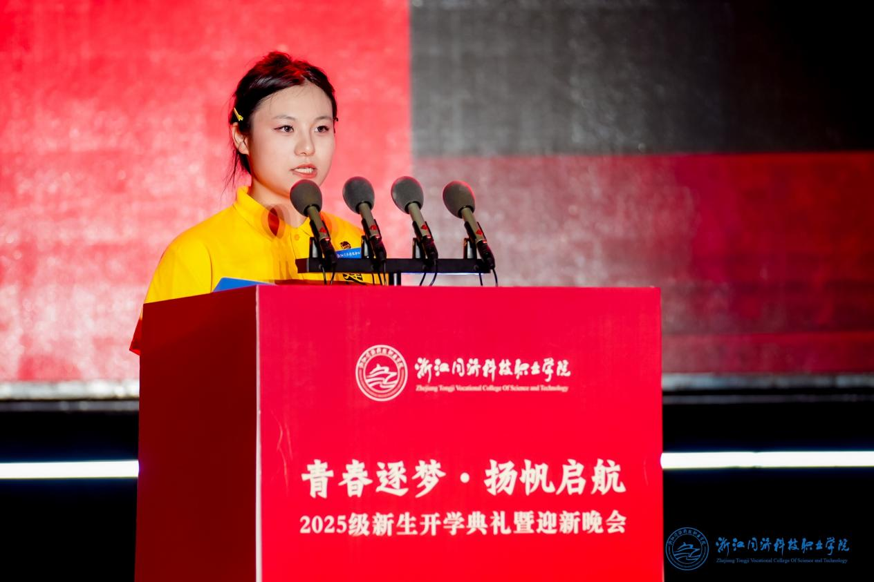 新生代表杜世佳分享了初入大学的憧憬与立志成才的决心;留学生新生代表David表达了跨海求学的热忱以及对多元文化交流的期待;优秀校友赵鹏则结合自身经历,分享了母校对其职业发展的深刻影响,并寄语学弟学妹珍惜韶华、不负青春。在军训教官的带领下,全体新生庄严宣誓,铿锵誓言回荡全场,彰显出新一代学子的昂扬斗志。