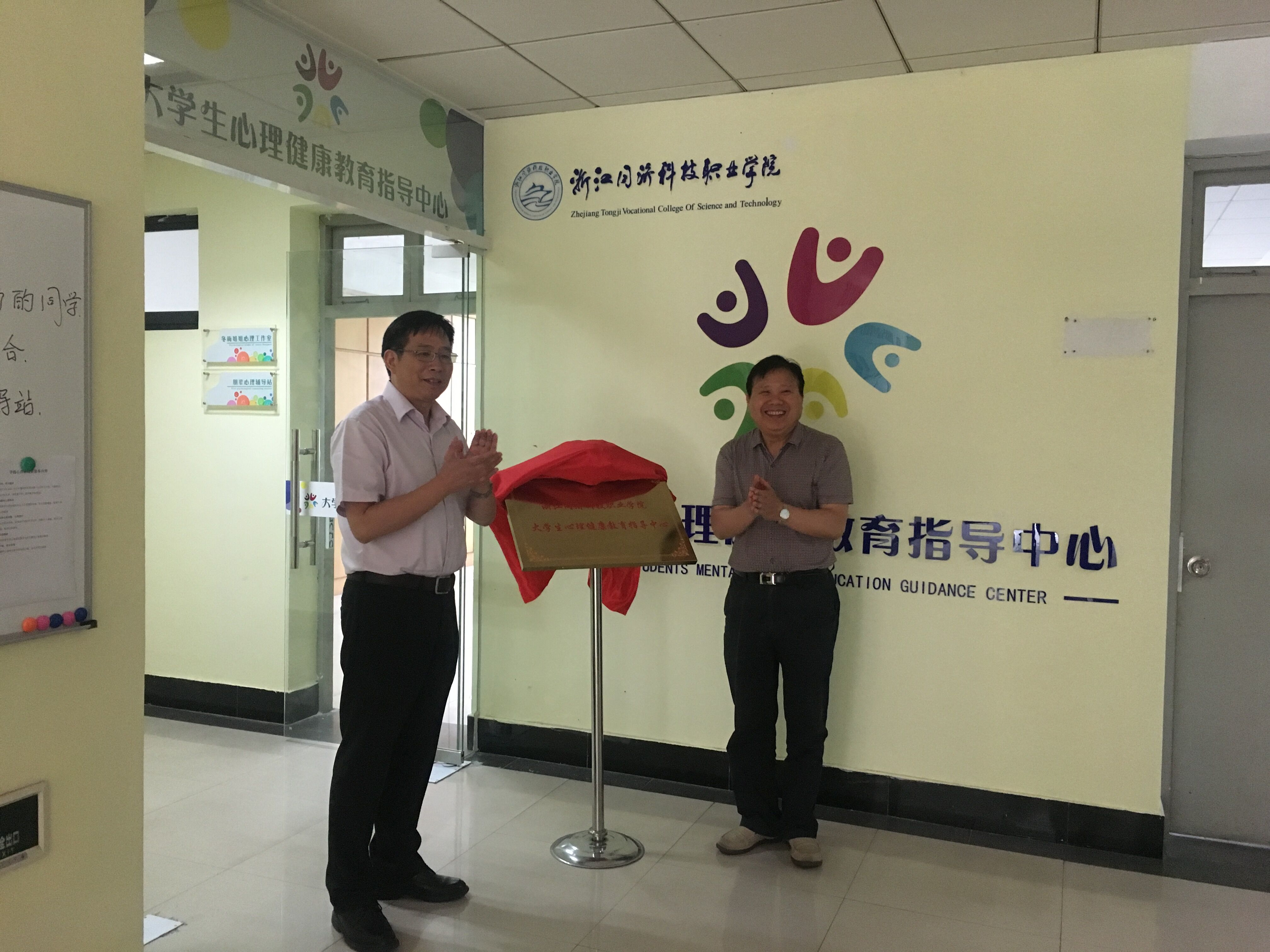 启动仪式结束后,滨江萧山高教园区管委会主任朱鸿飞、党委书记丁坚钢一起为大学生心理健康教育指导中心揭牌,并参观了装饰一新的心理中心各功能室。