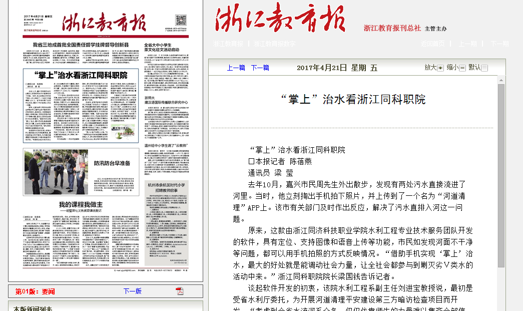 4月21日,《浙江教育报》头版以《“掌上”治水看浙江同科职院》为题,专题报道我院以“互联网+治水”的创新思维,结合水利院校专业优势,开发“河道清理”APP,发动全民参与剿灭劣五类水,创建了智慧治水新样本的典型事迹。