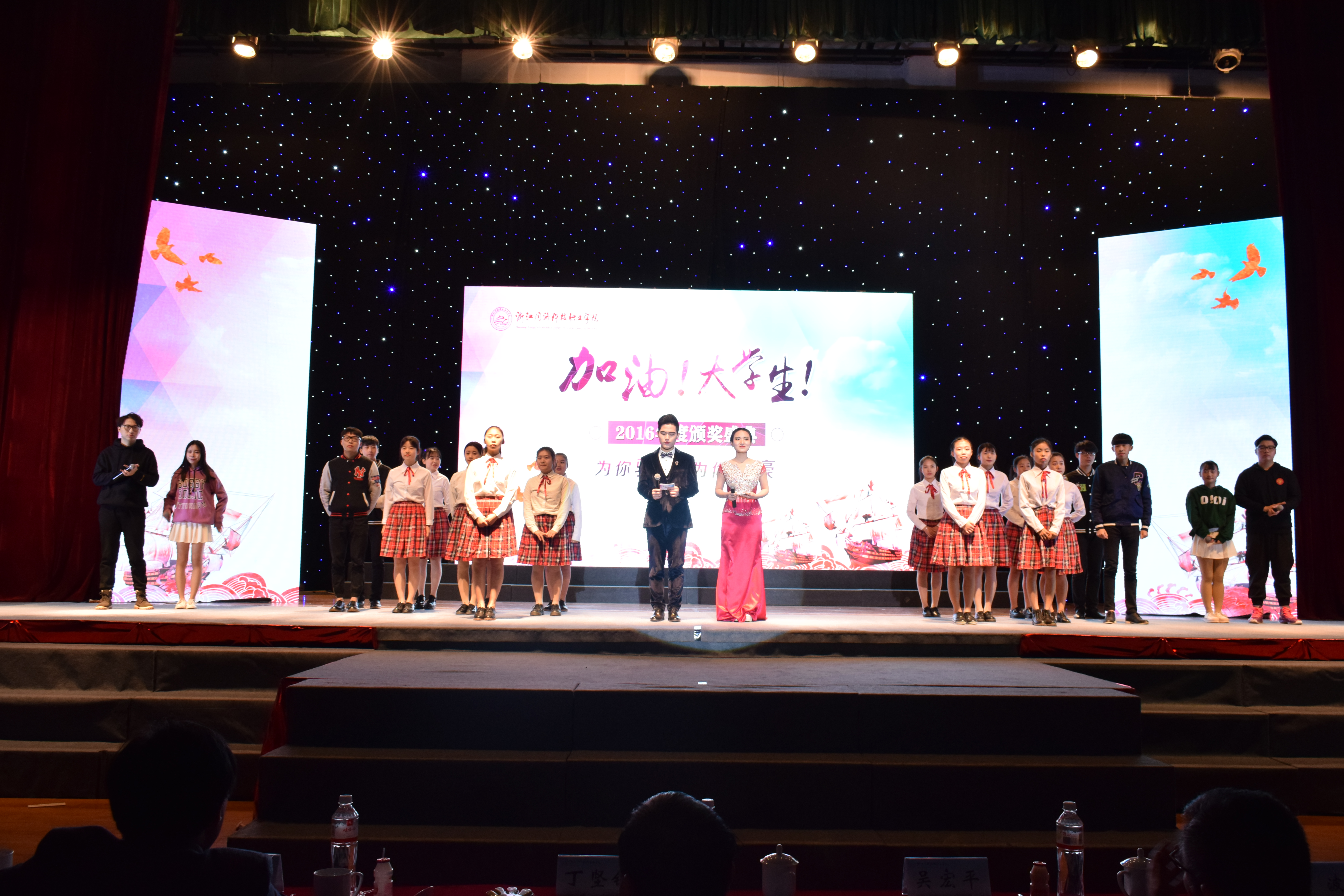 随着街舞《partition》的热辣开场,主持人宣布颁奖盛典开幕,接下来由学院党委书记丁坚钢老师上台致辞。丁书记对获奖的集体与个人发自内心的恭喜,也对学院的2017给予深深的祝福。随后,在各颁奖嘉宾风趣多彩的颁奖下,此次晚会先后颁发了2016年度十佳社团、2016年度五星级寝室、2016年度十佳大学生、2015-2016年第一学期学风优良班、2015-2016年第二学期学风优良班、2015学年学风示范班、2015学年一等奖学金、2015-2016学年浙江省政府奖学金、2015-2016学年国家奖学金等9个奖项。其中穿插由获奖集体和个人带来的节目表演《武之梦》、《木槿昔年》、《雷人舞》、《小幸运》都让同学们大饱眼福,优扬的《但愿人长久》以及充满活力的学生干部带来的《重返十七岁》更是将典礼气氛推向高潮。最后随着新年礼包的放送,加油大学生2016年度颁奖盛典圆满落幕!
