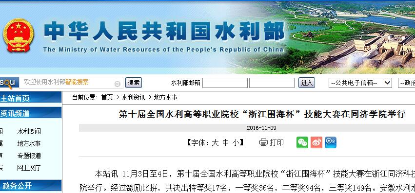 11月9日,水利部网站以“第十届全国水利高等职业院校“浙江围海杯”技能大赛在同济学院举行”为题,报道了我院举办该次赛事的情况。