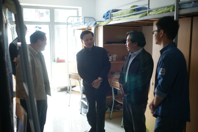 陈厅长一行先来到学院新建成启用的宿舍楼,陈厅长仔细查看了大厅的设施,并来到宿舍内,与同学们亲切地交流,了解他们的生活学习状况,鼓励他们认真学习,早日学成报效社会。
