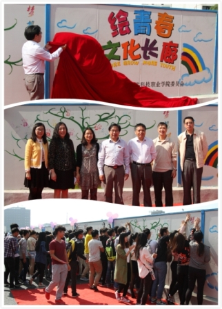 10月24日中午12时,我院第七届大学生艺术节开幕式暨“绘青春”彩绘文化长廊揭幕仪式在学院二期校园西墙举行。学院院长梁国钱、水利系党总支书记胡海清、建筑系党总支副书记方志英、机电系党总支书记富丹华、艺术系党总支副书记杨莉莉、信息系党总支副书记于会泉、团委副书记叶乐以及各系团总支书记、团线青年教师、院系学生代表出席了开幕式。