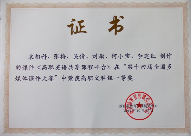 近日,由我院外语教学团队制作的多媒体课件《职业英语精品课程共享平台》, 在第十四届全国多媒体课件大赛中以综合总分第四名的优异成绩,获得高职文科组一等奖和最佳创意奖。