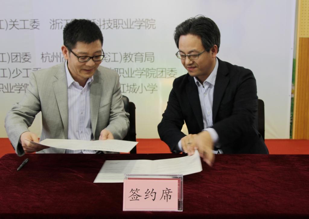 仪式上,叶泽主任与吴宏平副院长签订了校地合作协议书。随后,滨江区政府领导和学院领导共同为水文化宣传志愿服务队、“五水共治”校园宣讲志愿服务队、治水行动志愿服务队授旗。