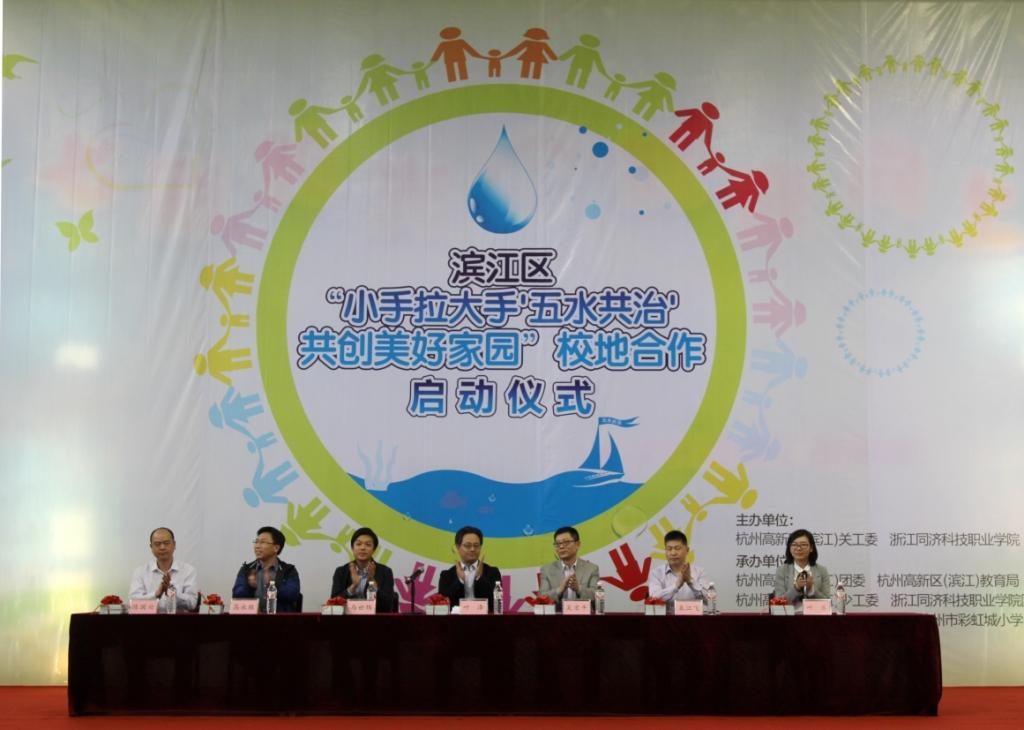 4月10日下午,“小手拉大手‘五水共治’共创美好家园”校地合作启动仪式在滨江区彩虹城小学举行,滨江区委常委、组织部长、高新区关工委主任叶泽,学院党委委员、副院长吴宏平,区教育局、团区委相关负责人,学院团委、水利系相关负责人出席启动仪式,学院青年治水突击队代表和彩虹城小学学生代表共计600余人参加启动仪式。