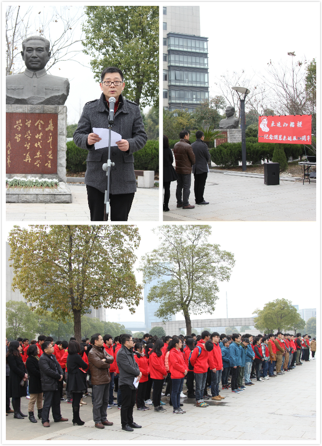 3月5日是个特别的日子,是我们敬爱的周恩来总理诞辰116周年纪念日,为了缅怀总理,号召大家学习伟人精神,由院团委组织开展的“永远的楷模——纪念周恩来同志诞辰116周年活动”在学院周恩来铜像广场举行。学院副院长吴宏平、学工部部长金永琪、团委副书记叶乐及各系党总支书记出席纪念活动。各系团总支书记、第五届周恩来班、邓颖超班、创建奖班级代表共350名优秀的学生代表参加活动。