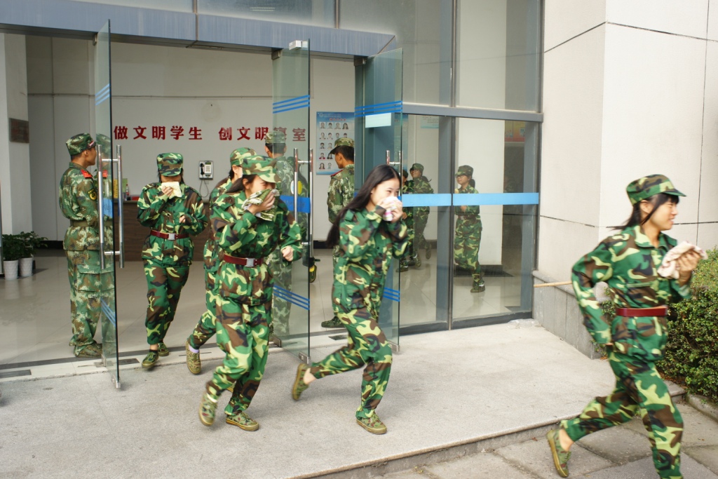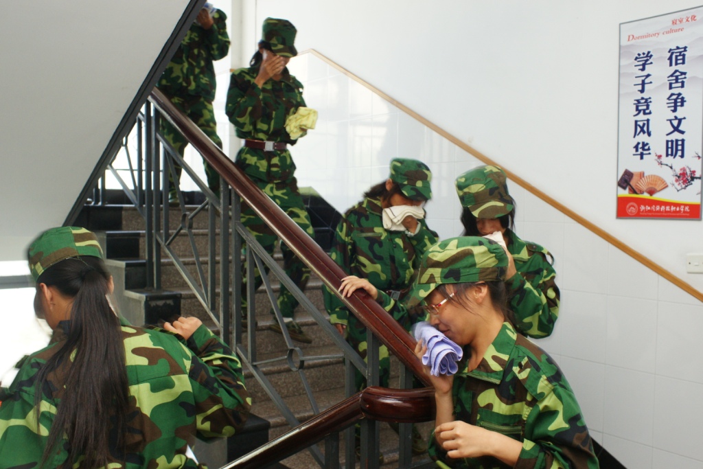 演习在A、B、C三个宿舍楼依次进行,参加的新生达2000余人,在部队教官统一指挥和各楼层引导员带领下,学生有序地手持毛巾或衣物捂住口鼻,沿墙根至消防通道快速撤离,按规定路线到达指定集合地点,整个演习过程紧张而有序。