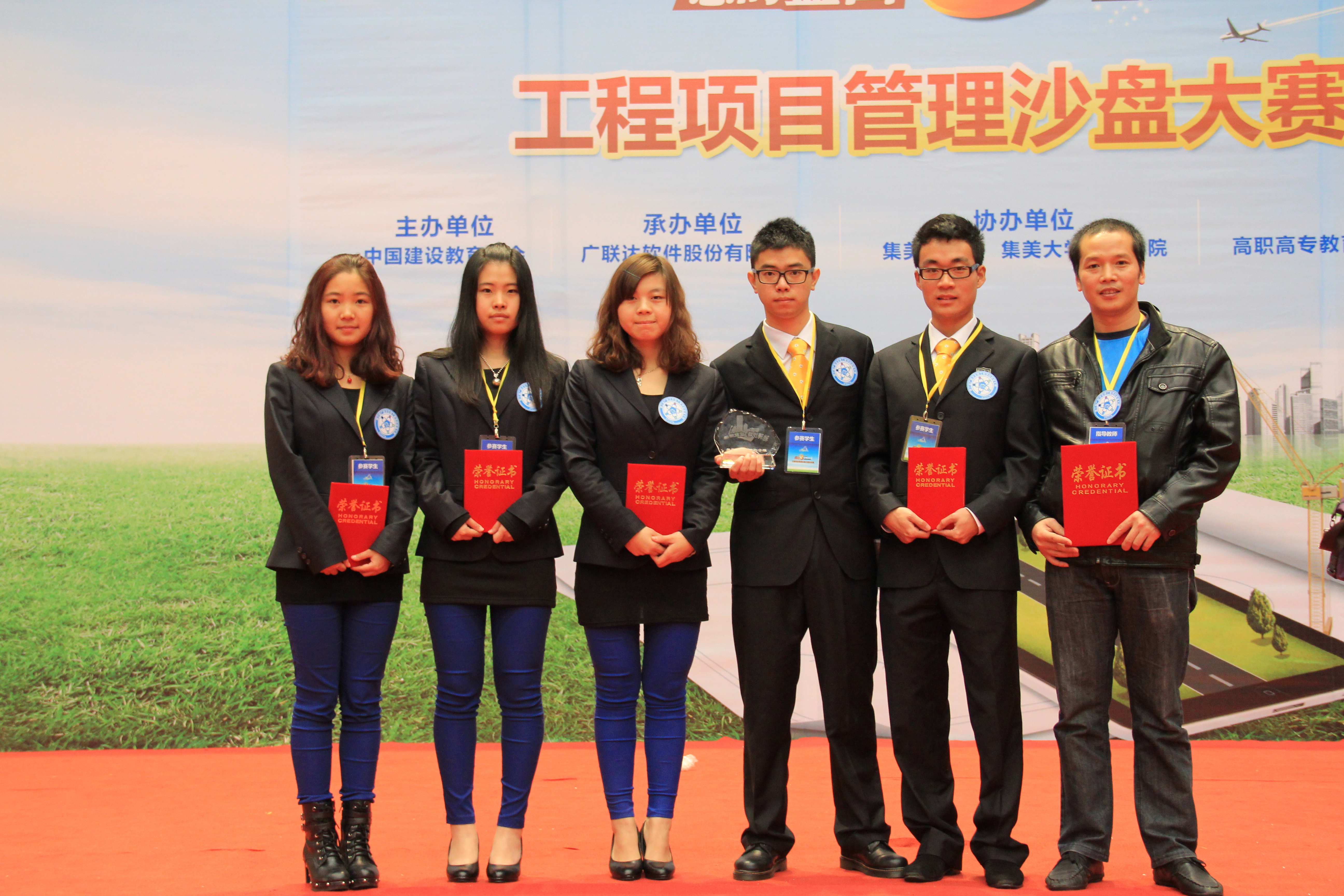 由我院信息系王邓红、厉莎和包连陈老师指导,10级建筑经济管理专业的杨宇、钱梦婷、杨朦朦、毛学娜、徐斌五位同学组成的“同舟共济队”获得了综合项目管理二等奖。为我院争得了荣誉,见证了学院建筑经济管理专业的教学质量和指导教师的教学水平,显示了建筑经济管理专业学生良好的职业技能、稳定的心理素质及精诚合作的团队精神。