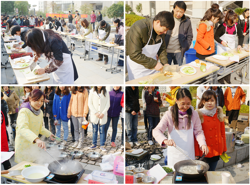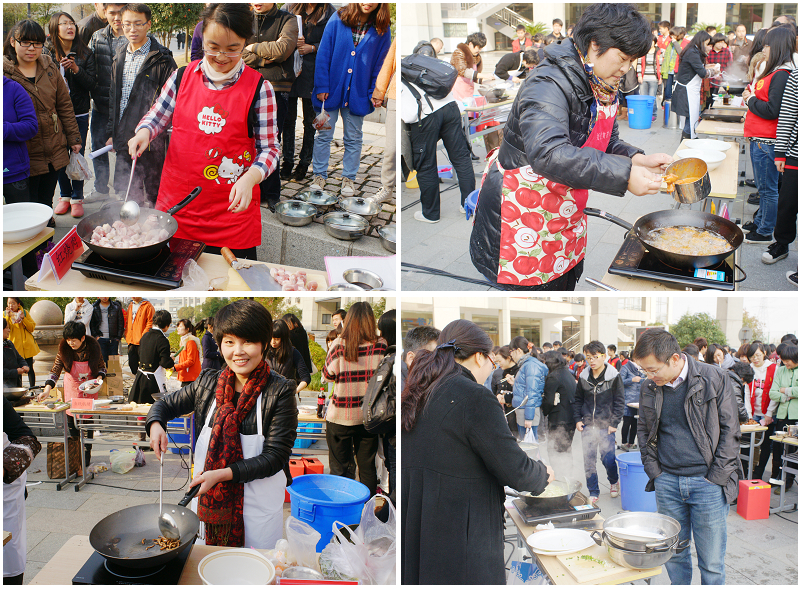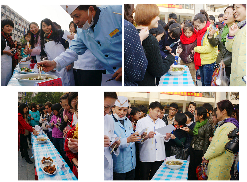 本届美食节不仅让前来参加的师生们一饱口福,更是设置了现场比赛环节,让有兴趣的人大展身手,也让没有上台参赛的人一饱眼福。瞧,设在食堂门口的丝丝袭来—刀工大比试、厨艺达人大比拼、迷你水果秀“创意拼盘”大赛、熬烧熬烧—厨师技能竞赛的比赛场地吸引了诸多人群驻足观看。平日里拿惯了粉笔、站惯了讲台的老师们脱下西装,系上围裙,拿起菜刀和炒勺,也是有模有样。在刀工比赛现场,几位老师熟练的刀工和精巧的手艺让观看人群不时发出阵阵叹声和掌声,而厨艺大比拼比赛更是热闹,选手们使出浑身解数烹制着自己的拿手菜肴,煎煮烹炸是样样精通,围观的人群更是左手持碗右手夹筷,一早围在锅边等候着佳肴的新鲜出炉,只等揭开锅盖的刹那便先下手为强。随着比赛时间的推移,一道道参赛选手的得意作品纷纷出炉:烩三丝、酸菜鱼、可乐鸡翅、张飞鱼头、鱼跃钱塘……这些菜还没来得及端上评委的桌子,已经被一边早已严阵以待的老饕们抢食精光,急的选手和现场的主持人满头大汗,连连央求大家嘴下留情,各种欢声笑语洋溢在赛场的上空。