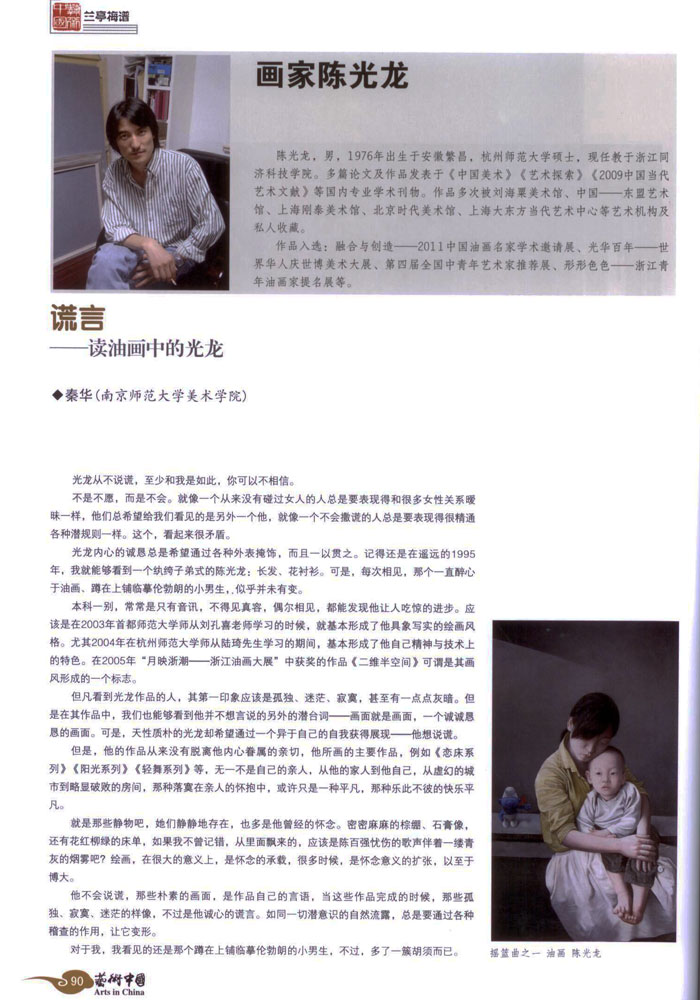 期刊《文艺生活•艺术中国》2011年第12期“兰亭梅谱”栏目,用了整整6个版面介绍了《画家陈光龙》和他的6幅油画作品,并发表了南京师范大学美术学院秦华博士的文章《谎言——读油画中的陈光龙》,对我院骨干教师、艺术系陈光龙硕士的油画作品和近年来在油画领域取得的成绩和进步进行了详细的点评和赞扬。