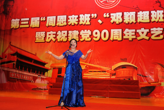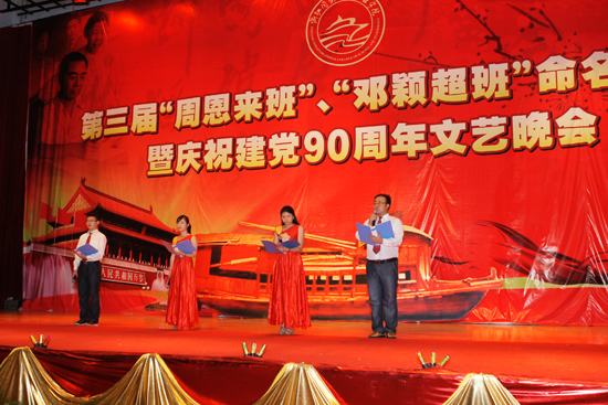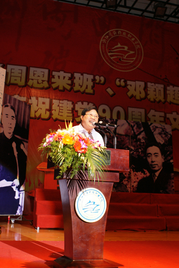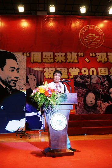 院党委书记丁坚钢代表学院讲话。他向上级领导的长期关心支持表示感谢。他表示,学院开展创建“周邓班”活动,就是要引导广大同学学习伟人的崇高品质、学习伟人的革命精神,并将伟人精神融入学习生活中,树立远大的人生理想,勤奋学习,立志报效祖国。学院将深入持久地开展这项活动,把它做成学院德育工作和校园文化建设的优势品牌,在全省高校中形成广泛的影响。丁书记希望通过今天的晚会进一步激发全院师生的爱国情操,激发热爱学院的热情,凝聚人心、凝聚士气,唱出激情,唱出干劲,用红色主旋律在学院营造出健康向上、团结奋进的氛围;以更加高昂的斗志,努力谱写学院发展的新篇章。