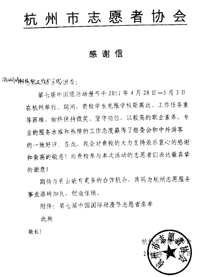 5月10日,我院收到杭州市志愿者协会的感谢信,来信表达了对于学院的感谢和对志愿者们最真挚的赞许。我院青年志愿者们表示,在未来的日子里将继续发扬“团结、友爱、互助、进步”的志愿者精神,参与更多的志愿者服务工作,共同为杭州市乃至浙江省的志愿者服务事业添砖加瓦,创造佳绩。院团委(供稿)