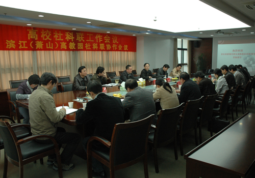 2011年4月8日下午,高校社科联工作会议暨滨江(萧山)高教园社科联协作研讨会在浙江机电职业技术学院召开,滨江(萧山)高教园9所高校的社科联主席、副主席、秘书长、科研处处长以及有关人员近30人参加了会议,省社科联周鹤鸣秘书长、褚京卫处长、胡晓立秘书等出席了会议,会议由省社科联周鹤鸣秘书长主持。我院陈海涵、吴敏启、张盈等三人应邀参加了会议。