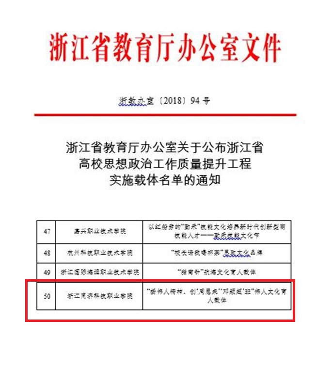 11月28日,浙江省教育厅发文公布浙江省高校思想政治工作质量提升工程实施载体名单,我院“扬伟人精神、创‘周恩来’‘邓颖超’班伟人文化育人载体”入选省高校文化育人示范载体。