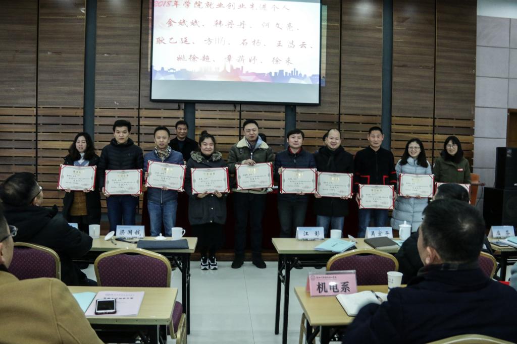 学院院长梁国钱宣读了先进集体、先进个人以及在2018年浙江省大学生创新创业大赛中获得奖项的指导教师名单。同时,会议对获奖个人和集体进行颁奖,机电系、工管系获得2018年度就业创业工作先进集体荣誉称号,金斌斌等十位老师获得2018年度就业创业先进个人荣誉称号。