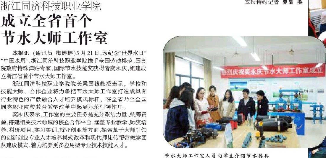 3月26日,《中国水利报》世界水日专题之“节水优先 我们在行动”特别策划,报道我院成立全省首个节水大师工作室。全文如下: