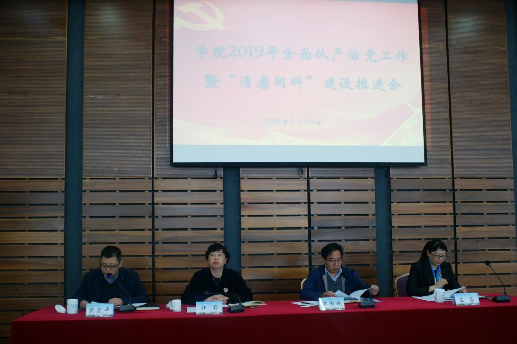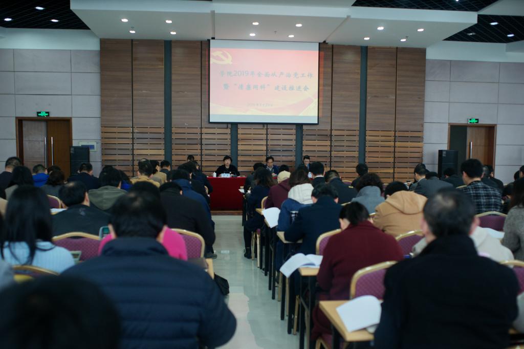 党委书记江影在讲话中对2018年全面从严治党工作进行了总结:一是坚持把政治建设摆在首位,切实提高政治站位;二是坚持党委统领全局,履行从严治党“两个责任”;三是抓实作风建设,激励干部职工履职尽责担当作为;四是严明党的纪律,强化监督执纪问责。她强调,2019年是新一届党委行政班子的开局之年,面对新形势新任务,必须要有新担当新作为。江书记对2019年全面从严治党进行了全面部署:一要抓统领,坚持把政治建设摆在首位,着力提高党委统揽学院发展全局的能力;二要把方向,坚持以思想建设为引领,自觉用习近平新时代中国特色社会主义思想武装头脑、指导实践、推动工作;三要强担当,坚持“咬定青山不放松”,全面推动管党治党“两个责任”落细落实落地;四要转作风,坚持把作风建设作为有力抓手,坚定不移把正风肃纪和反腐往深里抓、往实里做。为深入推进“清廉同科”建设,江书记从强化深化依法治校、提升提正师德师风、抓实抓细学风建设、管牢管严“小微权力”等方面,对2019年的工作提出了具体的要求。