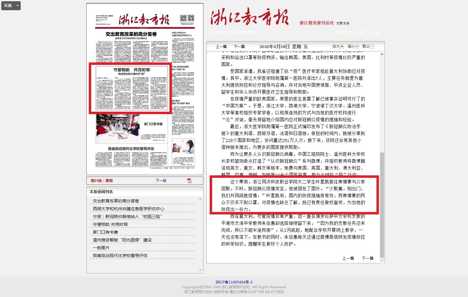 近日,我院学子叶星凯在柬埔寨免费发放口罩,助力当地抗“疫”的事迹登上《浙江教育报》头版新闻《守望相助 共克时艰 我省师生助力海外抗“疫”》 。