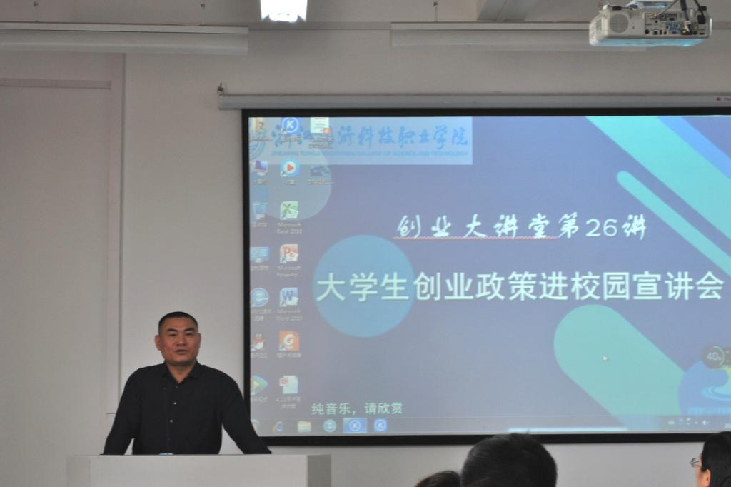 4月21日下午,萧山区留学人员(大学生)创业管理服务中心副主任詹文斌一行莅临我校调研指导大学生创业工作,并举办“创业政策进校园宣讲会”。学工部负责人、大学生创业园相关老师以及飞翔班学生、部分创业园入驻项目负责人、就业创业协会学生、有创业意向的学生等60余人参加了此次宣讲会。