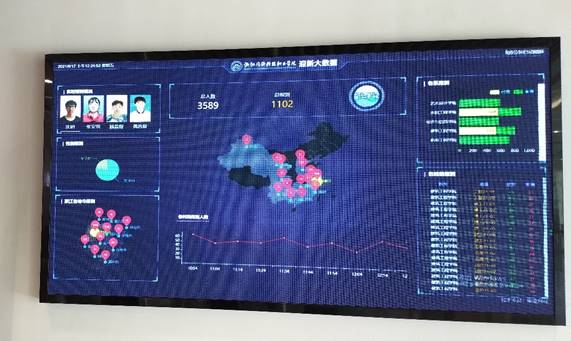 迎新现场搭建的数字迎新展示大屏,实时监控迎新系统数据,通过酷炫的统计图表、新颖的统计视角,实时展示整个新生报到工作的进程。