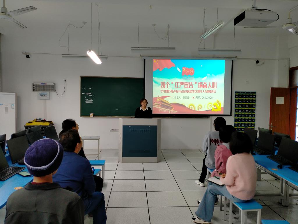 铭记百年党史,砥砺奋进前行。10月20日下午,机电工程学院电气自动化党支部在C402召开党员大会,电气自动化党支部书记滕丽娟以“四个‘庄严宣告’振奋人心——学习贯彻习近平总书记在庆祝建党100周年大会重要讲话”为主题给支部全体党员教师上了一堂生动、深刻的党课。