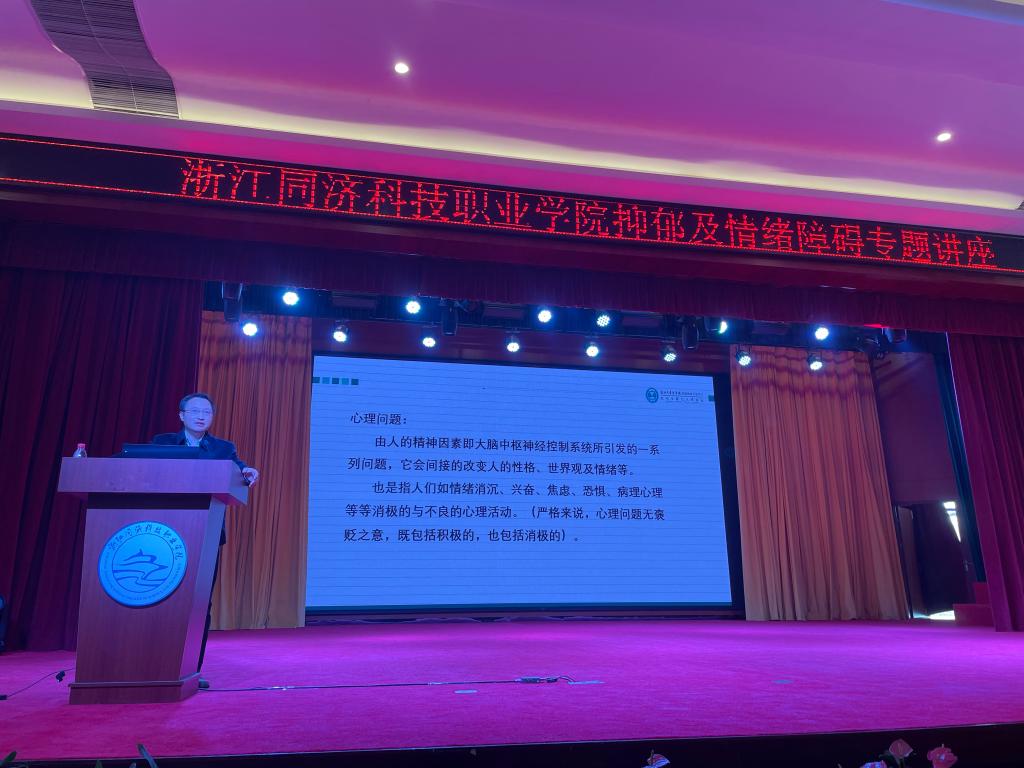 为提高我校师生对抑郁及情绪障碍相关知识的了解,及时消除学生心理危机隐患,构建和谐稳定校园,11月26日下午,我校与浙江省教职工心理健康教育中心合作,举办了《抑郁及情绪障碍》的心理健康专题讲座。本次讲座由浙江省医学会精神病学分会副主任委员、杭州市第七人民医院副院长陈致宇主讲。各二级学院党总支相关负责人、全体辅导员、班主任以及朋辈心理骨干等100余人到场聆听。