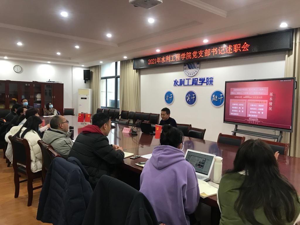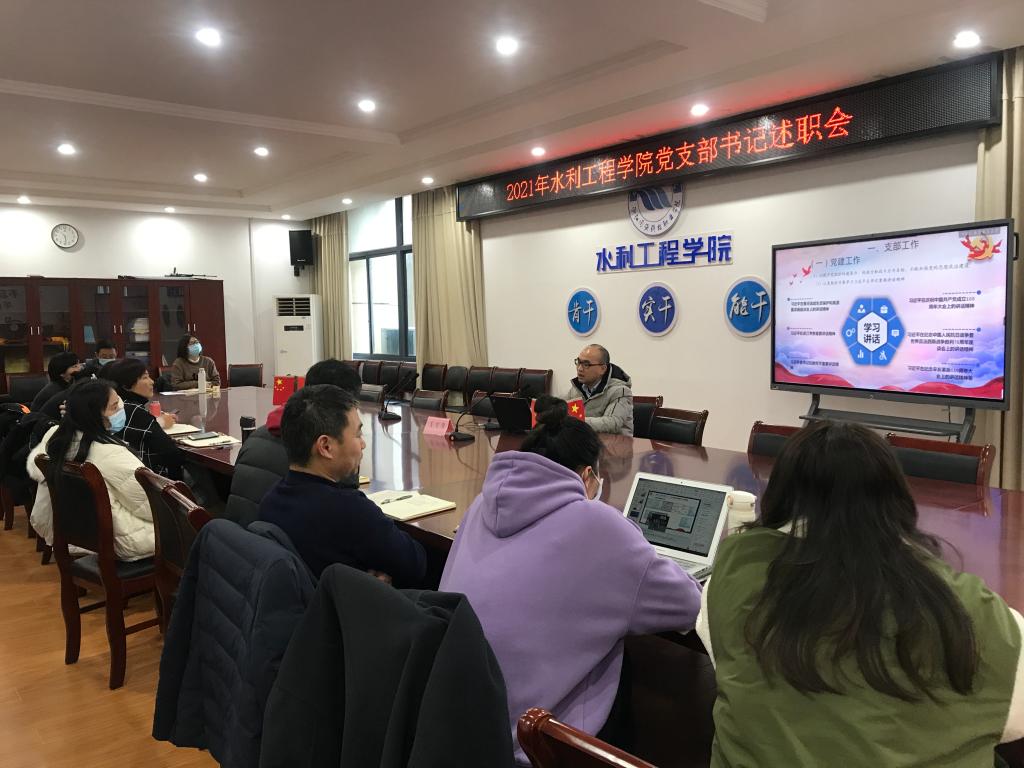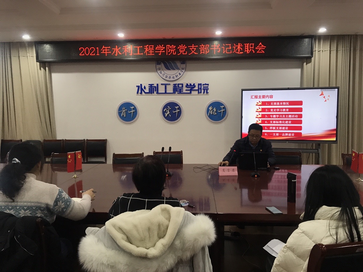 水工党支部书记厉莎、测量党支部书记刘勇、水生态党支部书记李若华、水管党支部书记朱友聪、学生党支部书记许源分别围绕党史学习教育、思想政治与意识形态工作、党风廉政建设工作、师德师风建设,以及在双高建设、科学研究、教学改革、基地建设、社会服务、生态兴水、疫情防控等工作中发挥先锋模范作用等方面依次进行述职。各党支部书记在述职报告中深度分析和查摆存在问题,提出解决措施,明确2022年党建工作计划。