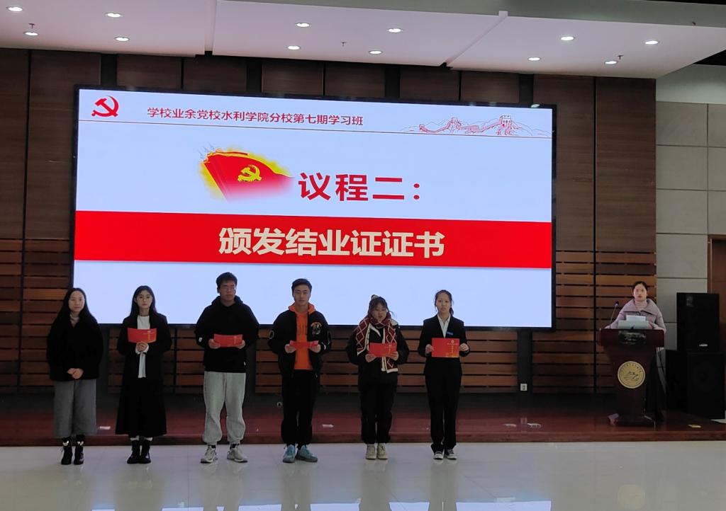 水利工程学院党总支于1月9日在行政楼三楼多功能厅举行了学院业余党校水利工程学院分校第七期学习班结业仪式。学院党总支书记叶乐、组织员及水利学院全体辅导员出席了结业仪式,共同评赏了学员红色历史情景剧的汇报演出,并为学员颁发结业证书和荣誉证书。
