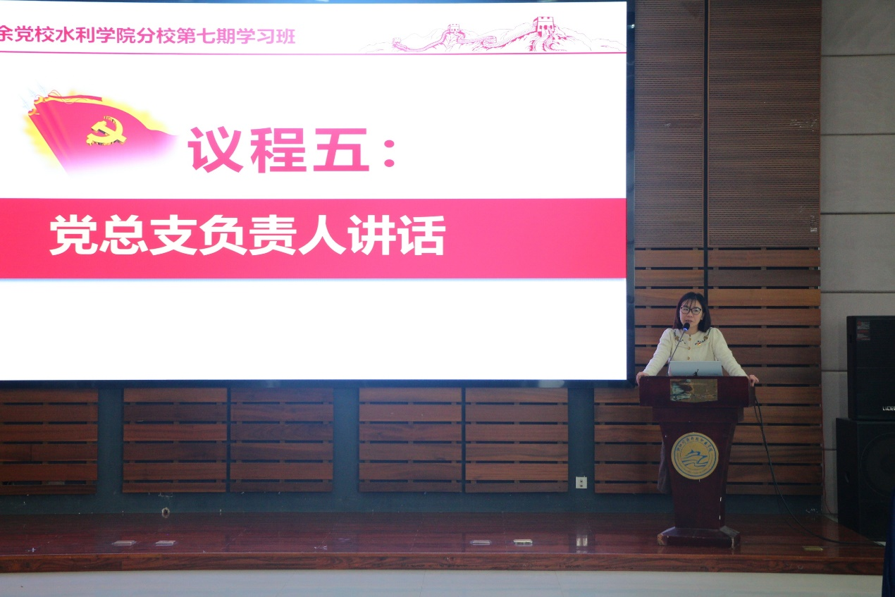 第五项议程是党总支书记叶乐对全体学员发表讲话。她首先高度肯定了本次学习班特别是红色历史情景剧这样的“沉浸式”学习方式的教学成效。并对学员们提出了三点期望,第一,坚持终身学习意识,在不断巩固拓展党史学习教育成果上下功夫,进一步做到学史明理、学史增信、学史崇德、学史力行;第二,强化责任担当意识,在专业学习上下功夫,为新时代水利事业发展积蓄力量;第三,树立榜样领航意识,在立足实践上下功夫,牢记身份,发挥入党积极分子的先锋模范作用。最后,叶书记号召全体学员要响应习近平总书记的号召,积极作为,满怀信心奋进新征程建功新时代。