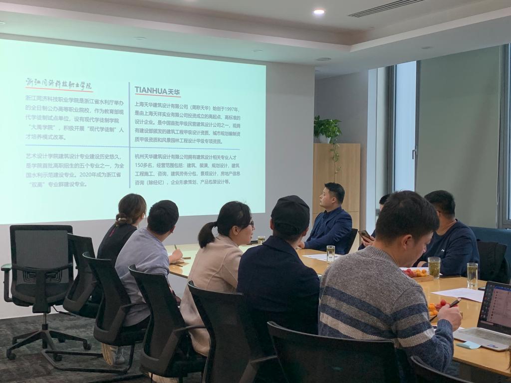 3月10日下午,为深入推进艺术设计学院建筑设计专业现代学徒制试点专业建设,艺术设计学院陆叶、刘益曦副院长及教务处马知瑶副处长携建筑设计专任教师张艳、杨薇佳,艺设学院校企合作专员魏争驰,及杭州天华助理总经理徐伟涛、融创中国设计总监高立、优秀毕业生陈斌杰和在校学生代表潘俊屹等建筑设计专业建设委员会成员共赴杭州天华建筑设计公司,召开现代学徒制试点专业人才培养方案论证会。与会的还有杭州天华总经理毛元庆、建筑总工林隽、设备总工何照傲、建筑一所所长裘敏、人力资源总监顾梦鏐等公司主要负责人。