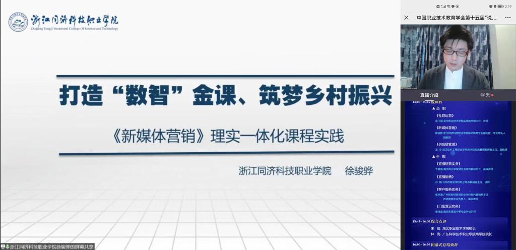 3月19至20日,中国职业技术教育学会第十五届“说专业•说课程•说专业群”研讨会在北京、济南两地连线举办。中国职业技术教育学会会长鲁昕,中共中央政策研究室原副主任郑新立、国务院参事汤敏,教育部职业教育与成人教育司副司长谢俐等领导出席。来自全国1500多所职业院校的校领导、教务处、二级学院负责人、专业群负责人、教研室主任、骨干教师等共计1.5万余人参会,9.8万人次线上观看和热烈互动。我校移动商务专业的案例《打造“数智”金课、筑梦乡村振兴--<新媒体营销>理实一体化课程实践》在全国近百项课程案例中脱颖而出,专业部主任徐骏骅在会上进行了主题分享,并受到了点评专家的高度肯定。