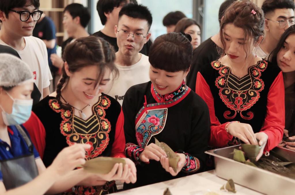 为加强同学们对传统节日的理解和认同,活动的最后还设置了包粽子环节,以巴旦木、葡萄干、和田枣等民族地区的坚果为馅料,寓意着各民族紧密团结、相互融合。在同学们的相互协助下,一个个晶莹剔透的“同心”粽,“团结”粽新鲜出炉。