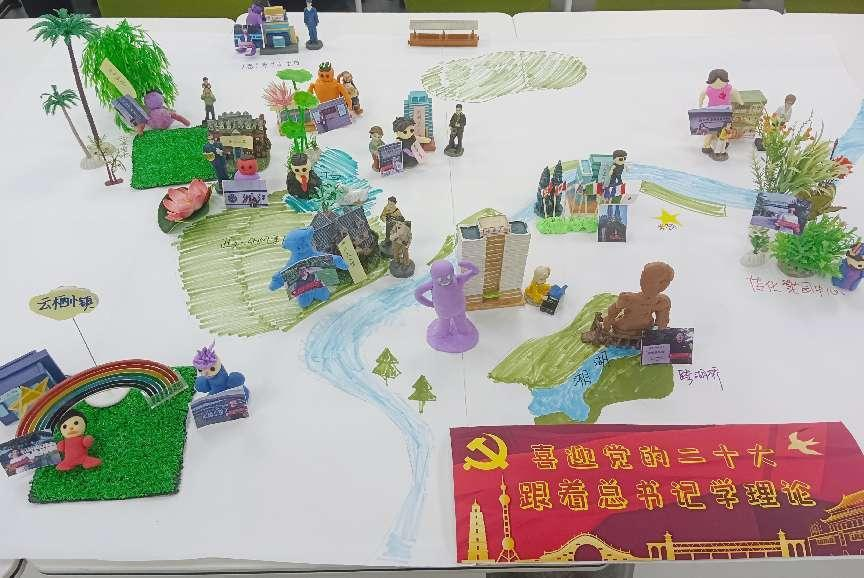 紧接着,党员师生们逐一进行主题分享,党员教师们打卡中国水利博物馆,深刻体会习近平总书记新时代的治水思想,分享学习科教兴国战略,强化现代化建设人才支撑的学习体会。金统航同学在西溪湿地打卡,他带领大家学习近平总书记关于“水是湿地的灵魂,自然生态之美是西溪湿地最内在,最重要的美。要坚定不移把保护摆在第一位,尽最大努力保持湿地生态和水环境。”让同学们更加深刻理解“绿水青山就是金山银山”和“山水林田湖草是个生命共同体”的发展理念及系统思想。朱林凯和胡地同学去到云栖小镇打卡,他们了解到杭州城市大脑平台在疫情防控中发挥了重要作用、体现了数字化治理能力和水平。陈宇航同学打卡海康威视,他分享道:“现在,无论是机械电子技术还是计算机和控制技术都在开始向智能化、人性化的方向发展,我们要提升自身的硬实力,希望日后能有机会为智慧化、科技化城市建设作出一点贡献,人民的生活将更加美好。”同学们在德清县信访局打卡,学习习近平总书记的“人民立场”;在浙江美术馆打卡,学习文化与艺术事业的传承;来到传化花园中心打卡,深刻体会农业高质量发展的重要性;打卡育英职业学院,学习“职业技能笃行不怠”大课题……老师和同学们沿着习近平总书记走过的道路,深入挖掘习近平新时代中国特色社会主义思想在杭州的生动实践,感悟“八八战略”在指引浙江改革发展中的历史伟力。师生们共同绘制出一幅丰富的打卡地图,通过沙盘形式进行充分呈现和分享。师生党员们原原本本、形式丰富、结合实际地学习了党的二十大报告。