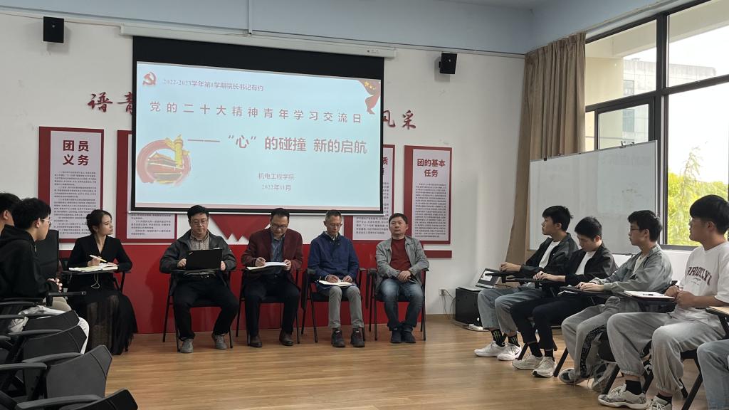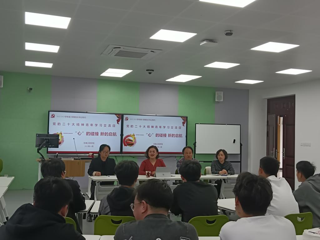 机电工程学院以省“党的二十大精神青年学习交流日”活动为契机,及时主动倾听生情生意,深入学生群体,了解需求,掌握新生入学后普遍关注的热点、难点、重点问题,进一步拓展学生与学校的沟通渠道,进一步做好思想政治工作。机电工程学院于2022年11月9日下午,分四场召开主题为“心的碰撞,新的起航”的“院长、书记有约”活动。