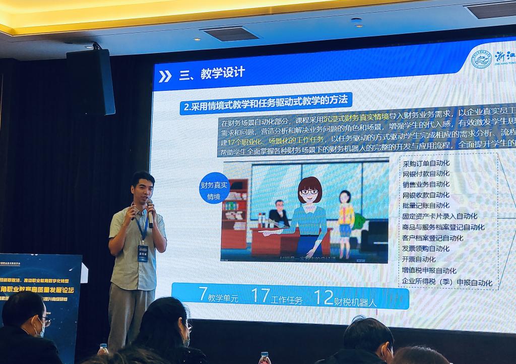 同时,经信学院教师徐明梁在智慧财经说课典型案例展示和经验交流分论坛上从教学背景分析、教学内容设计、教学设计及主要教学方法、教学实施及教学评价等方面分享了《财务机器人应用与开发》课程,荣获二等奖。