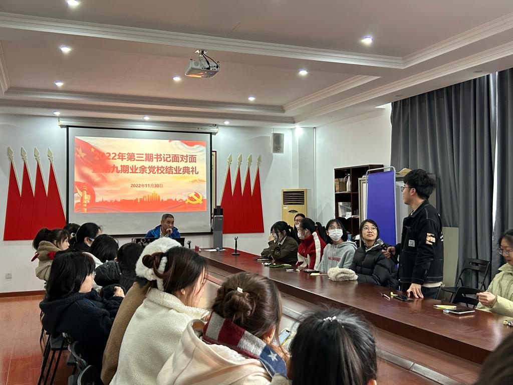 2022年11月30日,艺术设计学院2022年度第三期书记面对面暨第九期业余党校结业典礼在B506会议室举行。学院党总支书记张文炜、学生党支部书记王婷、学生党支部组织委员范芷毓、第九期业余党校学员和各班学生代表参加本次会议。会议由学院团总支组织部负责人巫裕程主持。